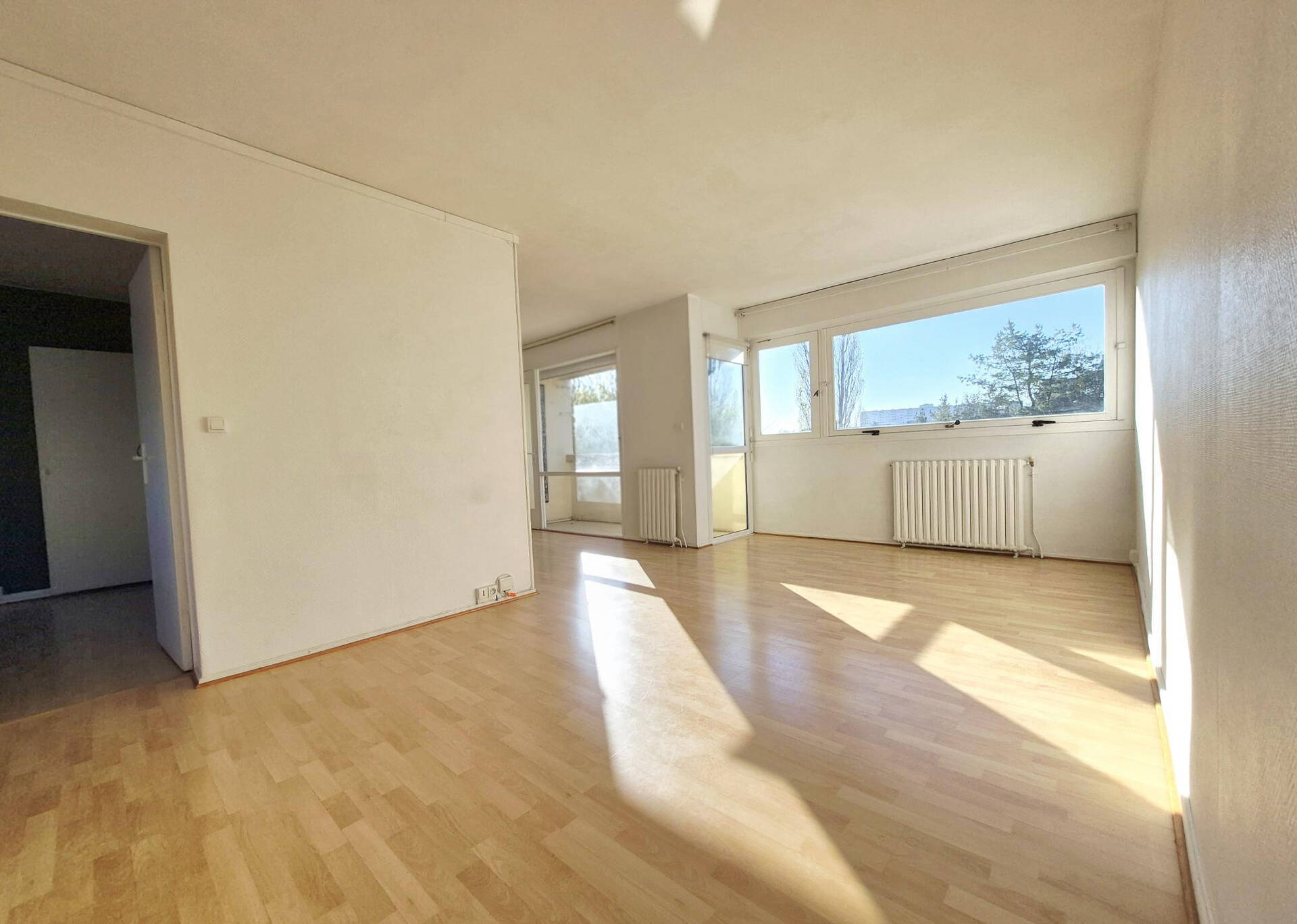 Double séjour lumineux avec accès balcon, offrant la possibilité de créer une troisième chambre.